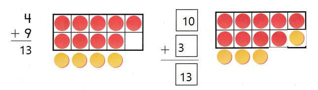 Kaitlyn wants to find 9 + 4. She makes a ten to add.